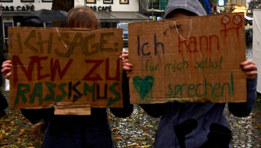 „Rassistische Äußerungen dürfen nicht in unserem Namen getätigt werden“, betont Leonie H., die gemeinsam mit Katja H und Susanne K. protestiert.