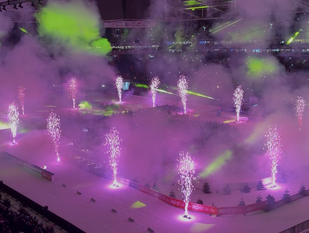 Bereits zu Beginn, zückt er sein Handy und hält die beeindruckenden Bilder auf Kamera fest. Funken und Lichtblitze erhellen die Arena und spiegeln sich im Schnee. Wenig später endet die Veranstaltung und die Ränge leeren sich langsam. Als Colin die Treppen vom Oberrang hinuntergeht, sagt er mit einem Grinsen im Gesicht: „Das kann man nächstes Jahr gerne wiederholen.“